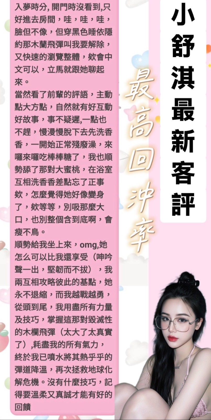 🏆服務項目:共浴/無套吹/舌吻(視口腔清潔)/小親親/按摩/乳交/胸推/臀推/舔蛋/品鮑/69/毒龍/角色扮演(性感內衣)…
